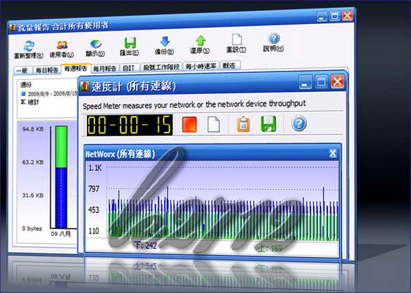 NetWorx 是一套可以即時觀看網路流量的工具,用顏色可以區別出上傳或是下載的流量,