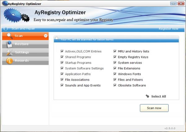 備份和恢復您的註冊表。 AyRegistry優化運行發揮了全面掃描通過Windows的註冊表,